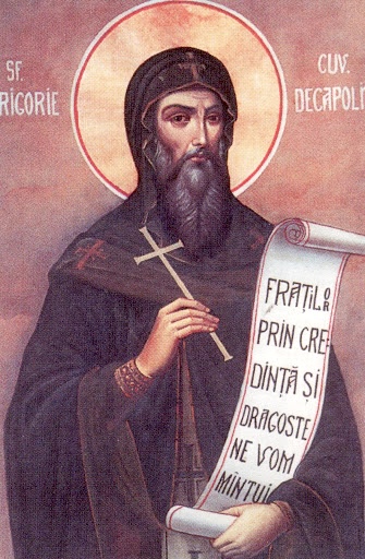 Преподобни Григорије Декаполит Рођен у Декапољу Исавријском од родитеља знаменитих и благочестивих, Сергија и Марије. Када сврши школе, хтедоше га родитељи оженити, но он одбеже у пустињу и замонаши се. Живео је на разним местима, као у Византији, у Риму, на гори Олимпиској. Где год је био, свуда је удивљавао људе својим подвизима и чудесима. Дешавало се да га је озаравала светлост небеска; да су му се ангели Божји јављали. Он је гледао красоту ангелску и слушао умилно појање њихово. Поживео дуго и богоугодно, и скончао мирно у IX столећу у Цариграду преселивши се душом у радост Господа свога.