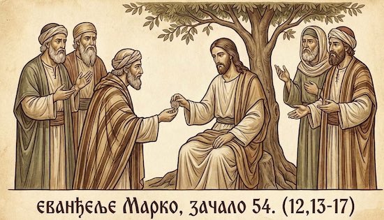 Јеванђеље Марко, зачало 54. (12,13-17)13. И послаше њему неке од фарисеја и иродоваца да би га ухватили у речи.14. А они дошавши рекоше му: „Учитељу, знамо да си истинит, и не обазиреш се ни на кога; јер не гледаш ко је ко, него заиста путу Божијему учиш. Реци нам, дакле, треба ли ћесару давати порез или не? Да дамо или да не дамо?”15. А он знајући њихово лицемерје рече им: „Што ме кушате? Донесите ми динар, да видим.”16. А они донесоше. И рече им: „Чији је ово лик и натпис?” А они му рекоше: „Ћесарев.”17. И одговарајући Исус рече им: „Подајте ћесарево ћесару, а Божије Богу.” И задивише му се.