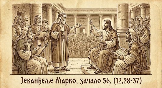 Јеванђеље Марко, зачало 56. (12,28-37)28. И приступи један од књижевника који их слушаше како расправљају, па видевши како им добро одговори, запита га: „Која је заповест прва од свију?”29. А Исус му одговори: „Прва је заповест од свију: 'Чуј Израиљу, Господ Бог наш је Господ једини;30. и љуби Господа Бога свог свим срцем својим, и свом душом својом, и свим умом својим, и свом снагом својом.' Ово је прва заповест.31. И друга је као и ова: 'Љуби ближњега свог као самога себе.' Друге заповести веће од ових нема.”32. И рече му књижевник: „Добро, учитељу, право си казао да је Бог један, и нема другога осим њега.33. И љубити њега свим срцем својим и свим разумом и свом душом и свом снагом, и љубити ближњега као самога себе, веће је од свију паљеница и жртава."34. А Исус видевши како паметно одговори рече му: „Ниси далеко од Царства Божијега." И нико се више не усуди да га запита.35. И одговоривши Исус рече учећи у храму: „Како говоре књижевници да је Христос син Давидов?36. Јер сам Давид каза Духом Светим: 'Рече Господ Господу мојему: седи мени с десне стране, док положим непријатеље твоје за подножје ногама твојим.'37. Сам Давид, дакле, назива га Господом, па откуда му је син?" И многи народ слушаше га радо.